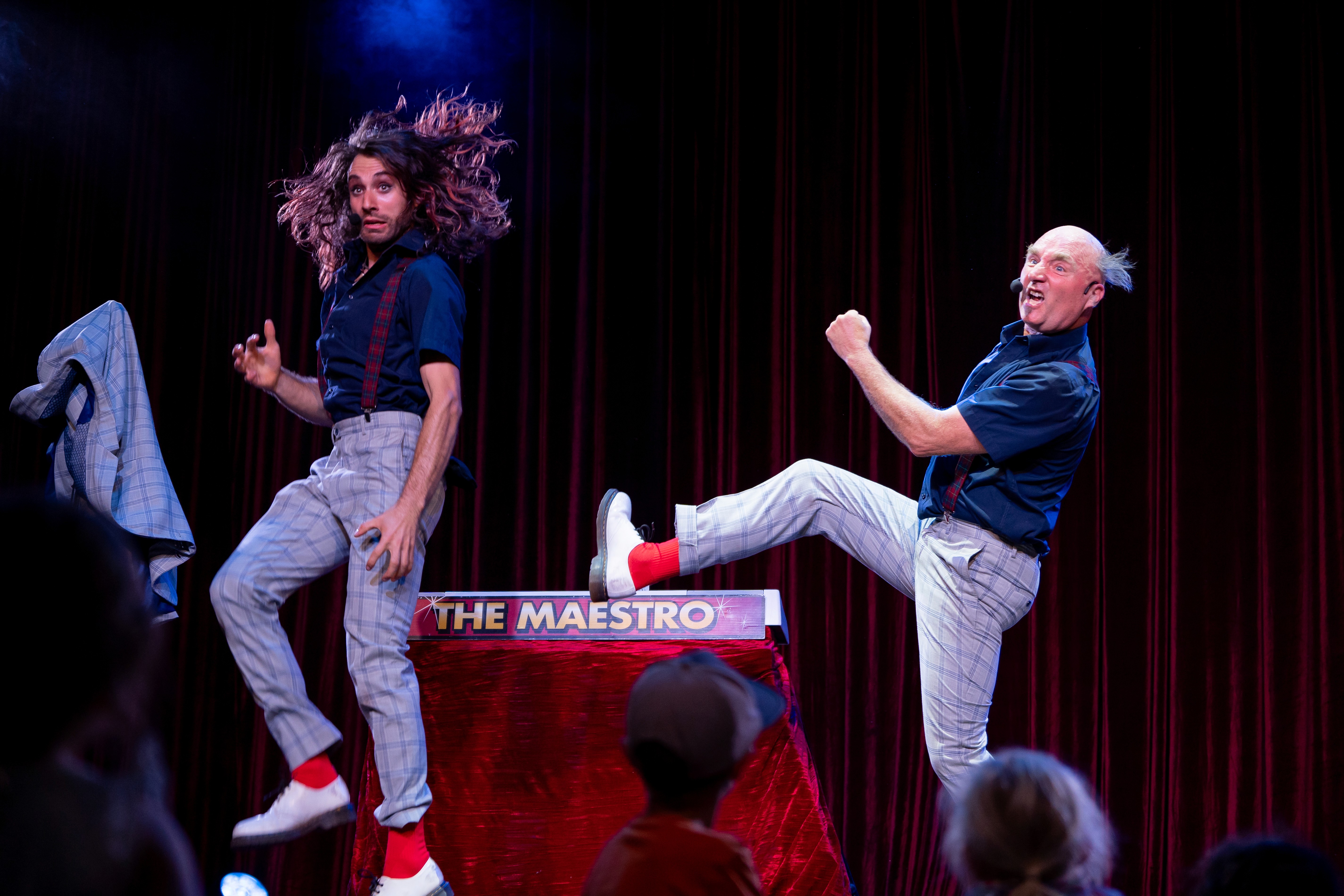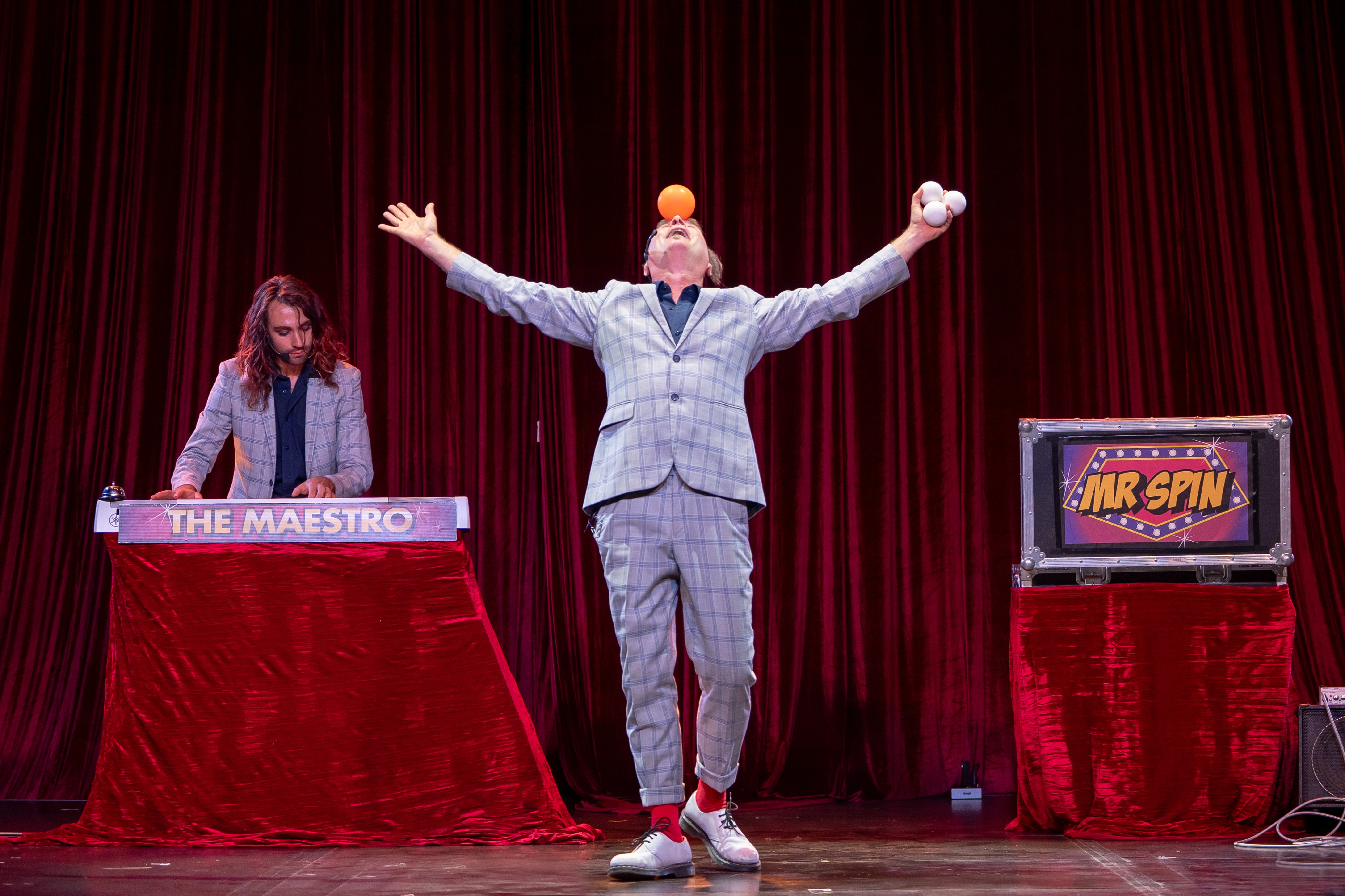 A father, a son, a mastery of seemingly impossible skills, and absolutely no plan for things going smoothly. Mr. Spin and The Maestro serve up high-risk juggling, glorious musical chaos, and perfectly timed brilliance disguised as disasters. One’s a seasoned show-off, the other’s suspiciously competent, and together they turn near-misses into standing ovations. It’s circus, comedy, and heart in a red-socked, laugh-out-loud package that somehow keeps topping itself. Bring the kids. Stay for the WOW.