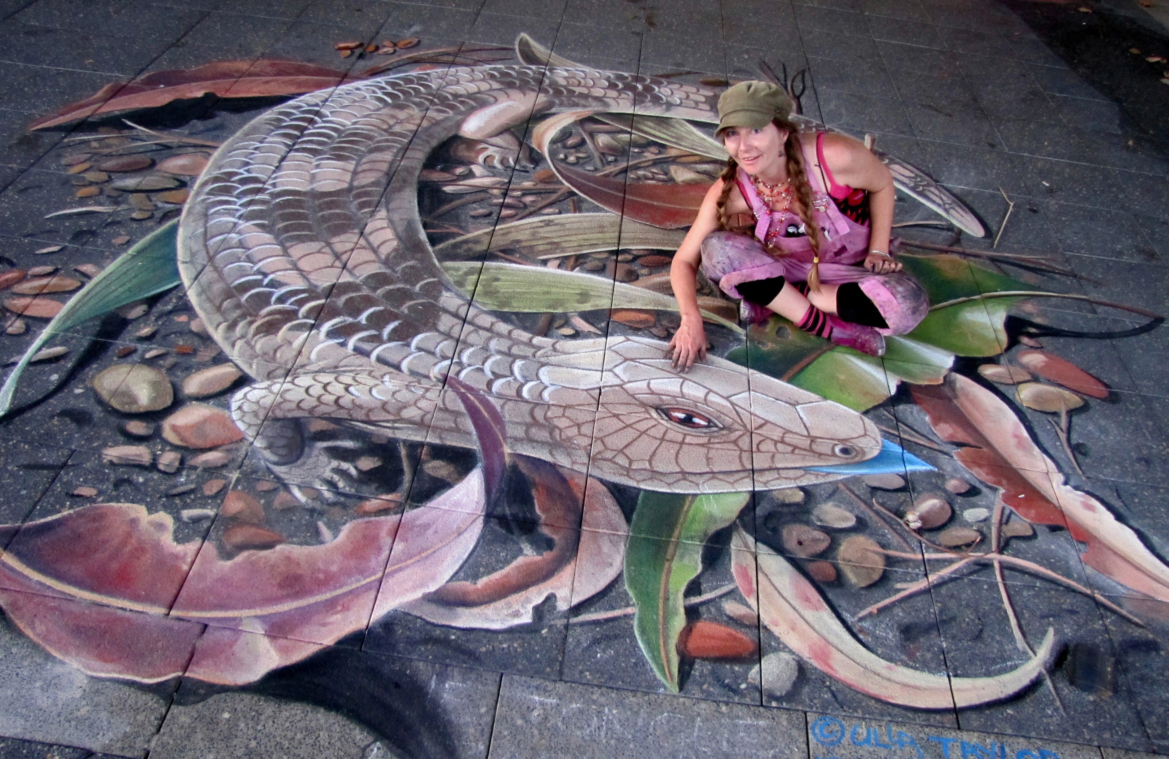 With pastels and knee pads in tow, Ulla Taylor creates contemporary chalk pavement art murals at festivals and events. With over 20 years experience creating public art at "grassroots level", Ulla's screevings are designed to delight.