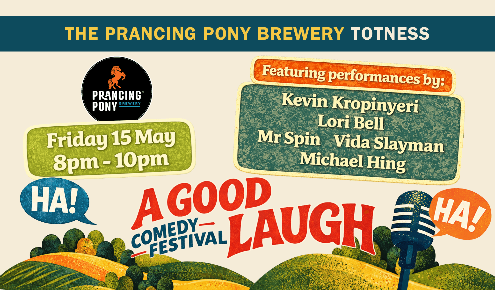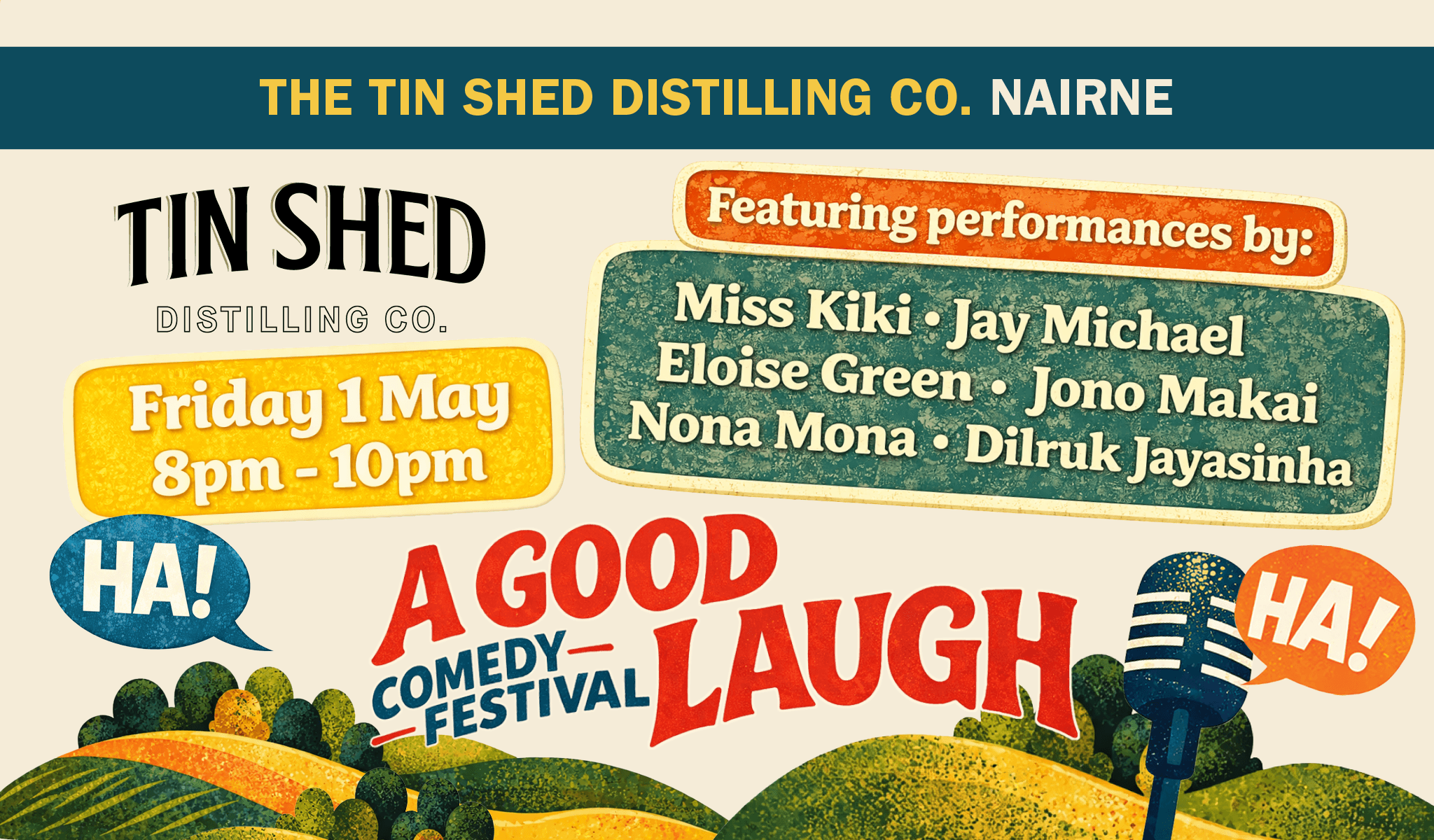 The inaugural A Good Laugh, South Australia's only comedy festival, heads to the Adelaide Hills from Friday 1 May to Saturday 16 May – three weekends, 20+ comedians, and seven unique venues including Tin Shed Distillery Co., Prancing Pony Brewery, and Mount Barker Town Hall.