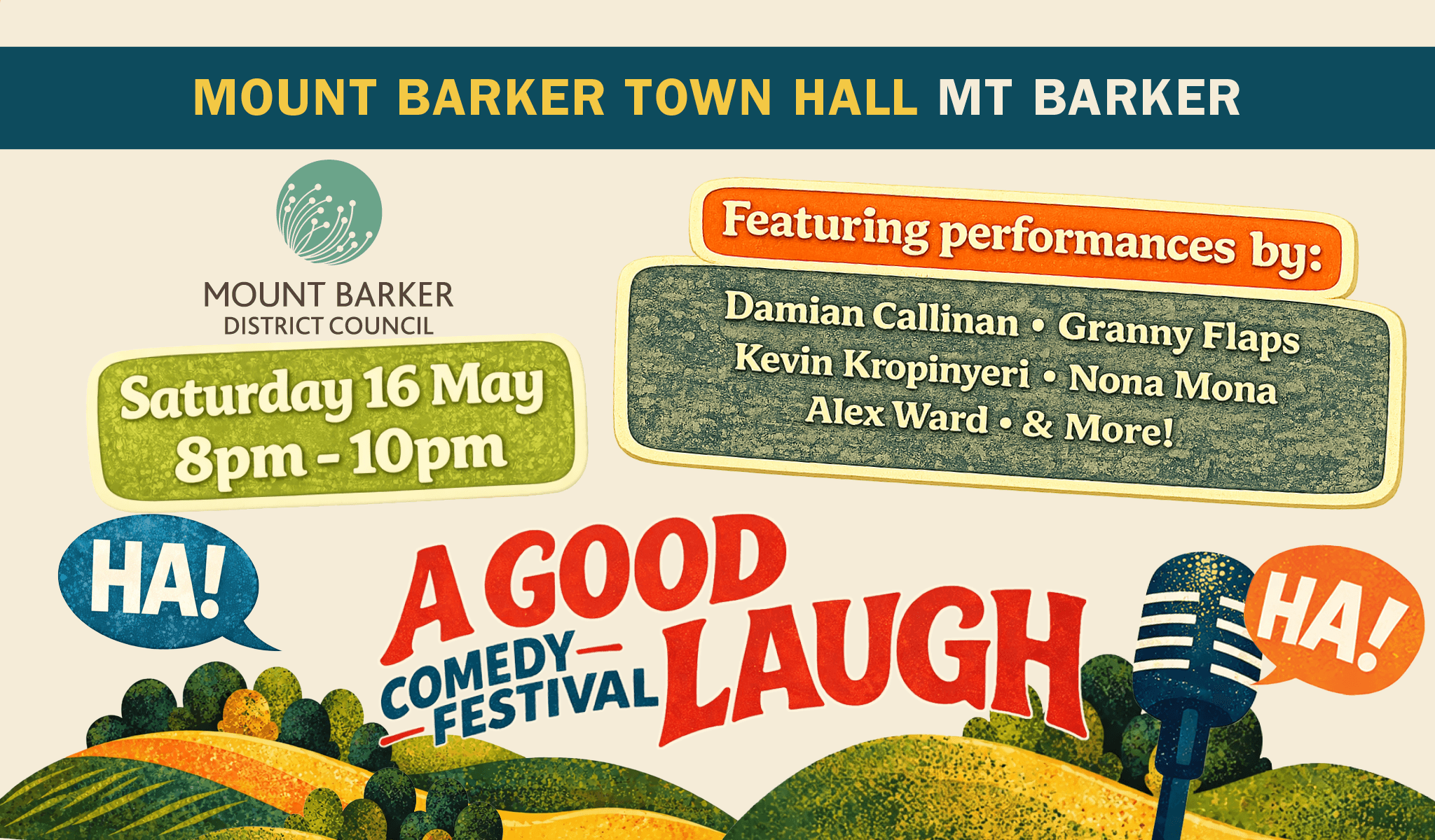 Claire Hooper, Damian Callinan, Dilruk Jayasinha, Melinda Buttle, Alex Ward, Michael Hing, and Kevin Kropinyeri – A Good Laugh is presented by Bamboozled Productions with support from Mount Barker District Council.